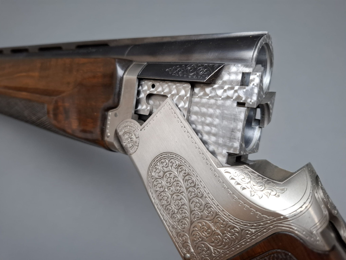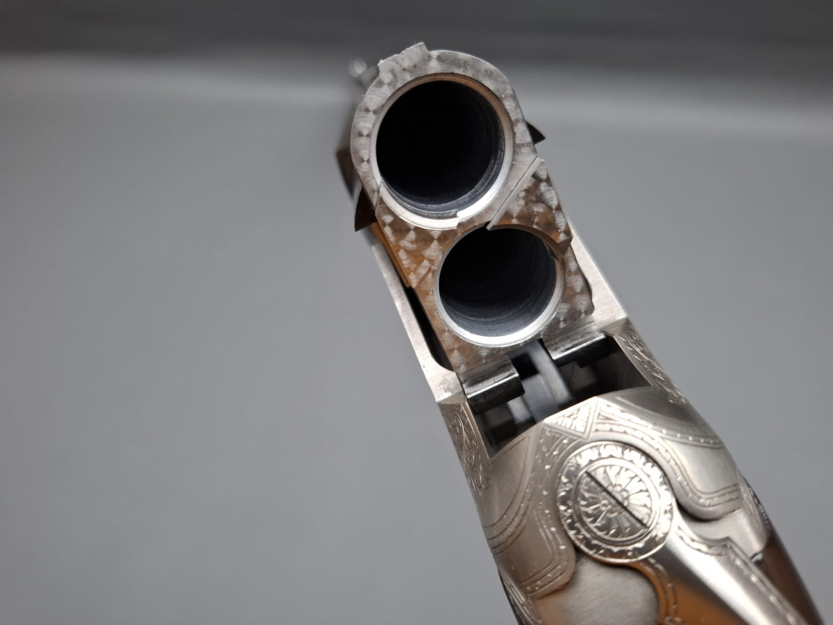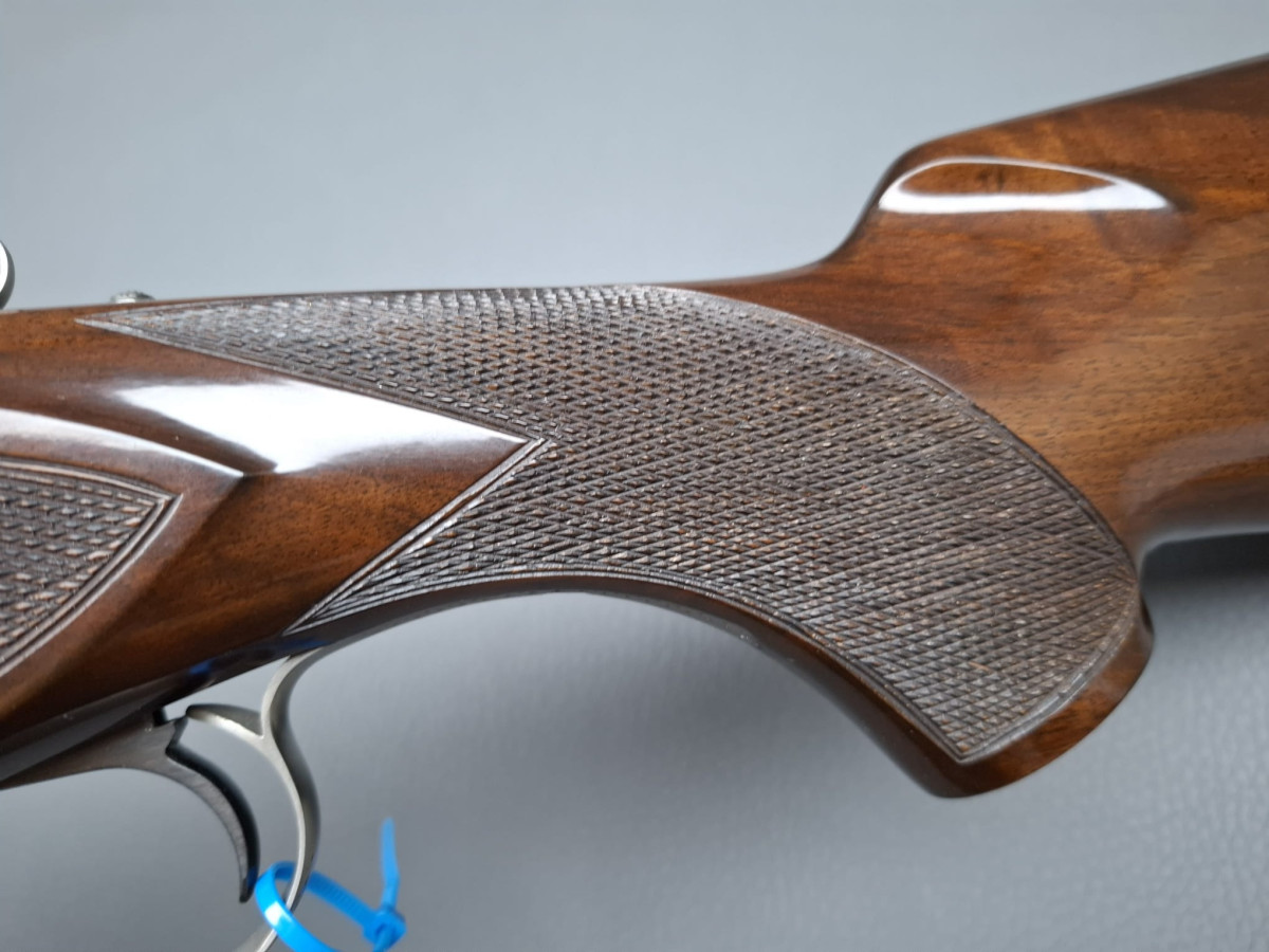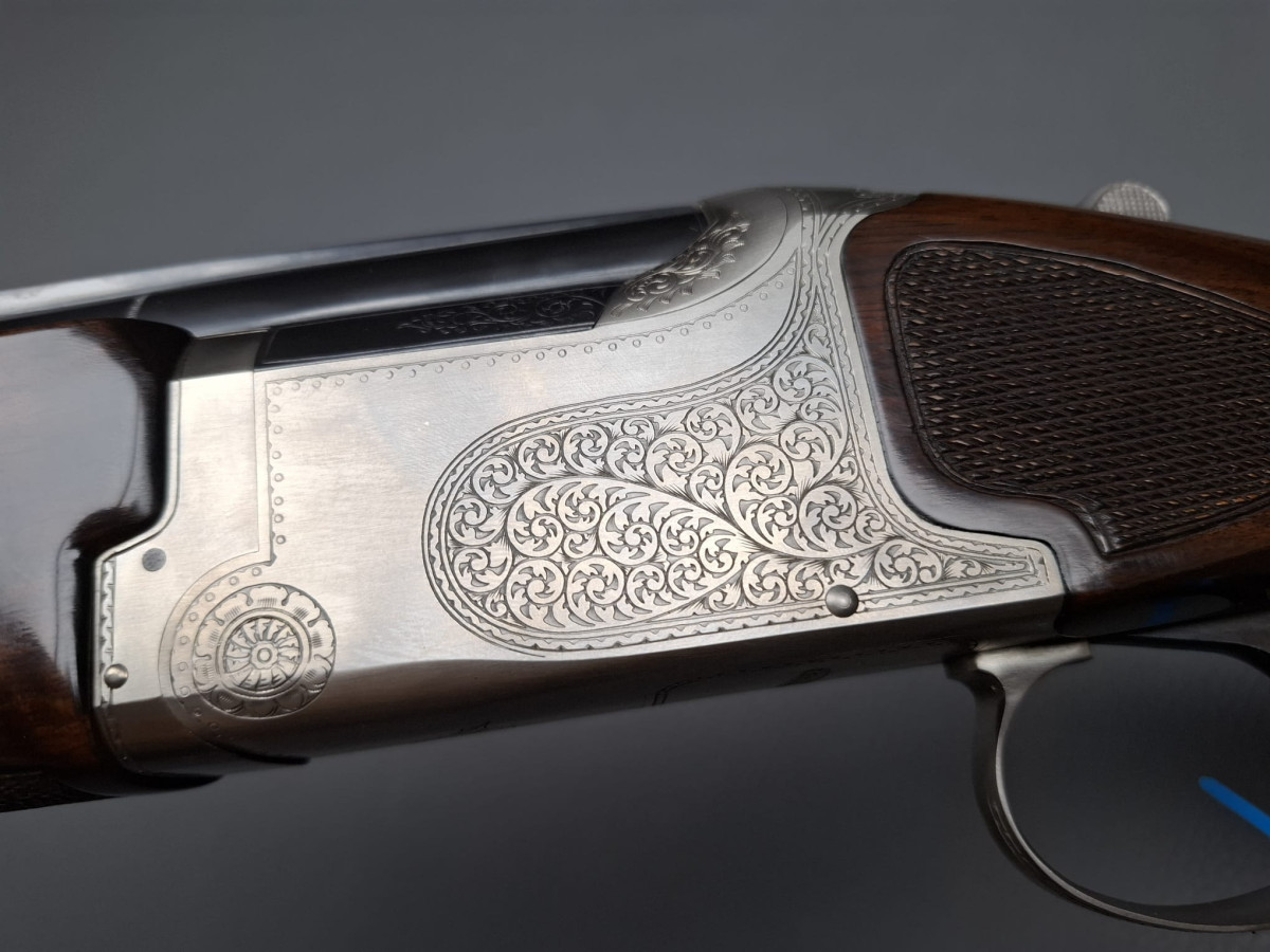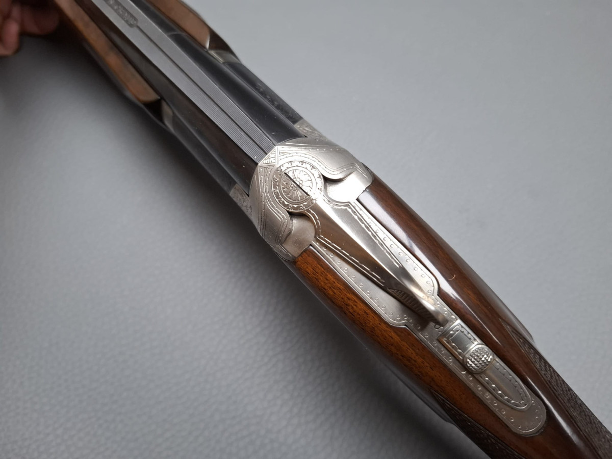 breite ventilierte Laufschiene, helles Perlkorn und Hilfskorn, Ejektoren, Einabzug mit Umschalter, Stahlabzugsbügel, Sicherungsschieber auf dem Kolbenhals. Nußbaumschaft ohne Backe und ohne Schränkung, für Rechts- und Linksschützen geeignet Läufe sehr gut, Verschluß dicht, leichte Gebrauchsspuren, Brünierung 97% Gebrauchtwaffe sehr gut