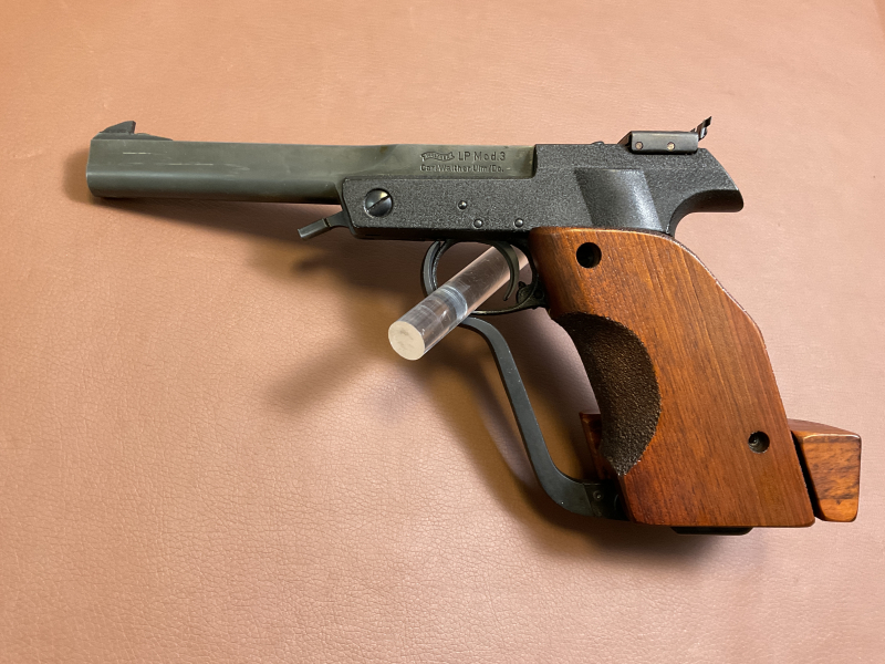 Zum Verkauf steht eine Luftpistole Walther Modell 3 Luftpistole mit der Seriennummer 26752. Die Pistole verfügt über einen größenverstellbaren Rechtsgriff.