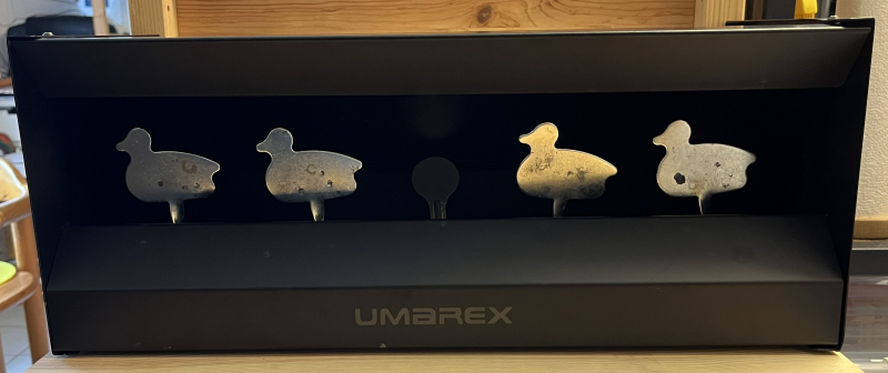 Stahl - Kugelfangkasten mit vier Klapp-Enten / mit Aufstellfunktion.