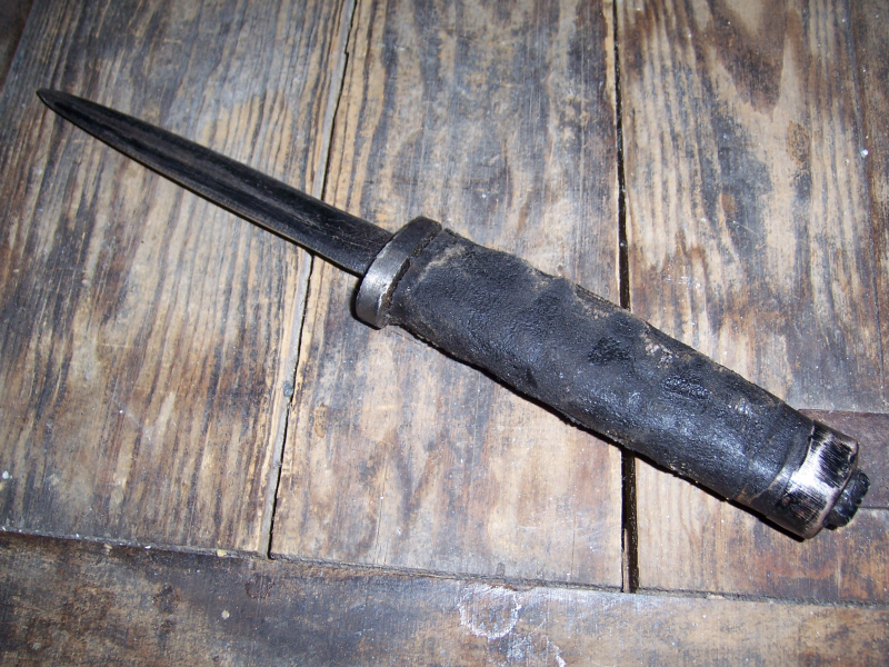 Altes Nahkampfmesser eines deutschen Soldaten ---- Aus Nachlass erworben ------ Holzgriff umwickelt mit altem Isolierband ---- Klinge stark beschliffen und brüniert. --- Vermutlich gefertigt aus Offiziers-Dolch. ---- Am Griffende ist noch ein Totenkopf zu erkennen ------ Gesamtlänge ca.26cm ------ Historisches Original, wohl im Schützengraben gefertigt. ----- Aus gleichem Nachlass stammt auch ein Ärmelband mit einem gesticktem Totenkopf und Stempel Hängt bestimmt zusammen.