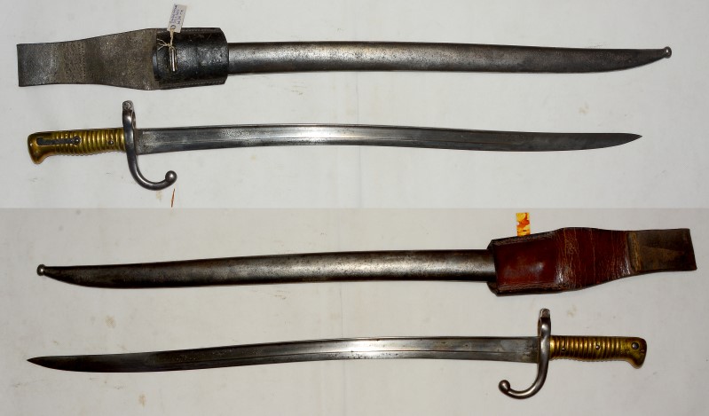 Französisches Chassepot-Bajonett Mle 1866, keine Herstellerinschrift, komplett mit original Koppelschuh, Gebrauchs- und Altersspuren aber noch gut