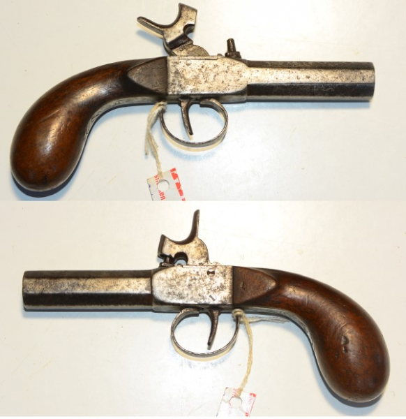 Terzerol mit Perkussionsschloss, 6-eckiger 6,2 cm langer Lauf, Gesamtlänge 17,4 cm, Kaliber 12 mm, Alters- und Gebrauchsspuren, funktionell