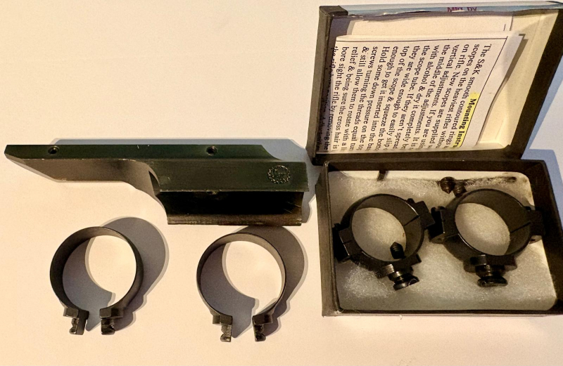 Verkaufe eine gebrauchte aber voll funktionsfähige S&K Mounts USA Montage US M1 Carbine mit 30mm Ringen und 25,4mm (1 Zoll) Ringen. Äußerliche Gebrauchsspuren aufgrund des Alters wie auf den Fotos zu sehen. Es sind noch 4 neue Madenschrauben für die Montage der jeweiligen Ringe dabei. Wird einfach anstatt der Kimme auf dem M1 Carbine befestigt.