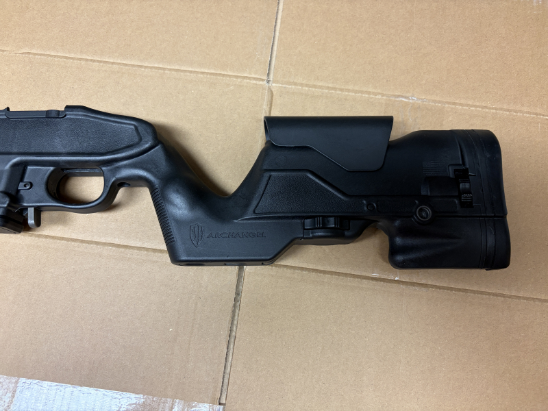Zum Verkauf steht ein „Archangel AA98 Precision Stock“ in Backenhöhe und Schaftlänge verstellbarer Kunststoff Schaft mit Zweibein in schwarz mit herausnehmbarem Magazin für 5-10 Patronen.