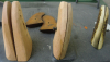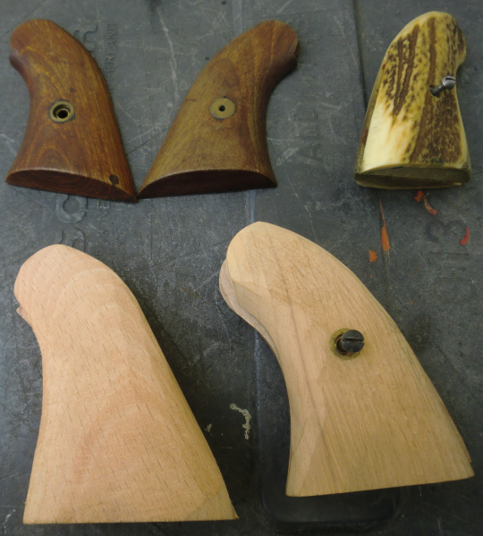 Das 3. Paar ist aus vermutl. Buche, vorgearbeitet und entspricht dem Original, bloß etwas fülliger. Mit Griffschalenschraube und eingelassenem Gewindestück