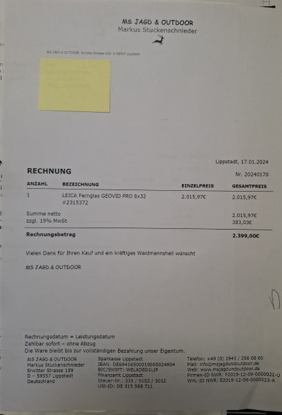Verkaufe neuwertiges FG Leica 8x32 PRO. Aktuelles Modell, technische Daten siehe Leica HP. Aktueller Preis bei Frankonia 2700€. Komplettes Zubehör, die OVP und deren Umkarton ist dabei.