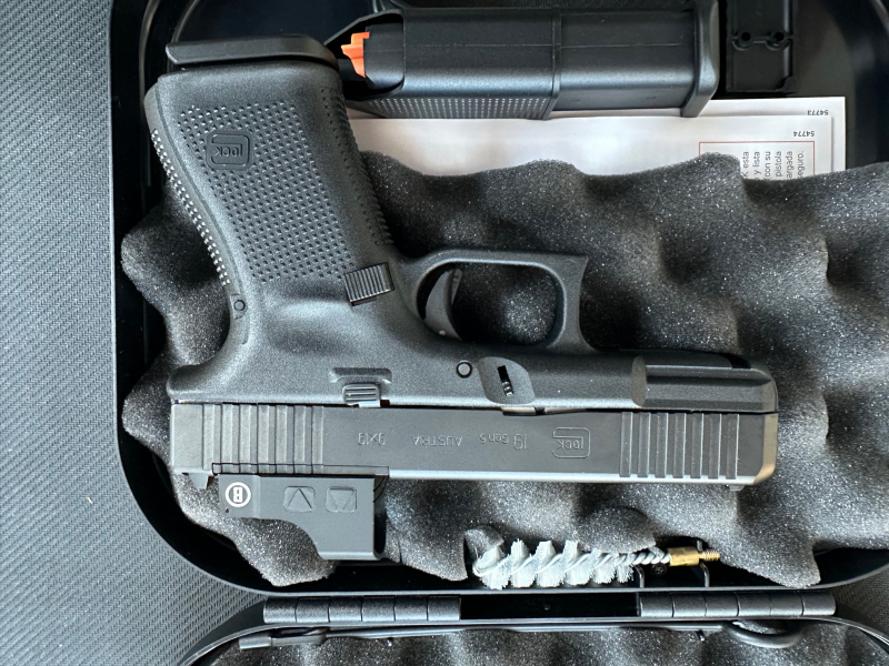 Glock 19 Gen5 MOS in 9mm Luger mit 15 Patronen Fassungsvermögen. Bereits montiert ist dort ein Bushnell RXS 100 Leuchtpunktzielgerät mit rotem 4 MOA messenden Leuchtpunkt. Manuell anpassbare Leuchtintensität. Waffe und Leuchtpunktvisier sind neu. Auf Wunsch auch auf ihre Laborierung/Entfernung eingeschossen. Lieferung im originalen Koffer mit Putzset, Adapterplatten und Reservemagazin. Volle Garantieansprüche. Abgabe nur an gültige EWB. Einlagerung bis zum Erhalt des Eintrages kostenlos möglich. Bei Fragen einfach eine E-Mail schreiben. Die Lieferung erfolgt deshalb unter Ausschluss jeglicher Gewährleistung und aller vertraglichen Schadensersatzansprüche. Mit der Abgabe Ihres Gebotes erklären Sie sich damit einverstanden. Umtausch oder Rückgabe ohne meine vorherige Zustimmung sind ausgeschlossen