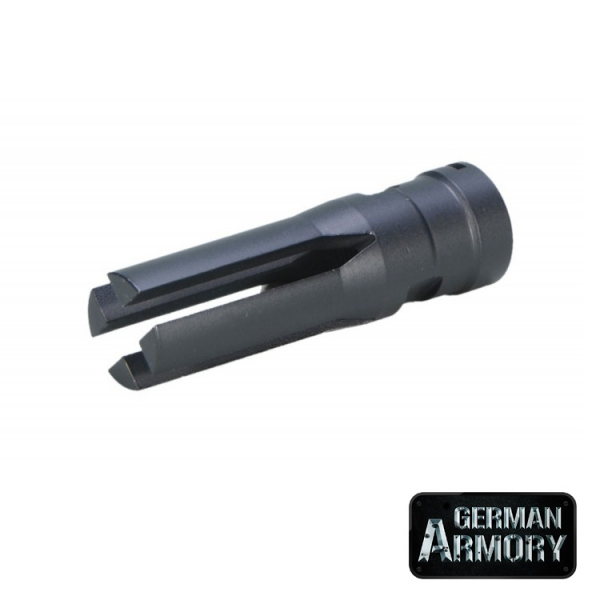Dieser Mündungsfeuerdämpfer hat rundum Öffnungen. Die Verbrennungsgase werden zu allen Seiten abgeleitet und verringern so spürbar den Hoch- und Rückschlag. Hoch fester Stahl, einbrennlackiert. 72mm Länge, 22mm breit.
