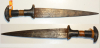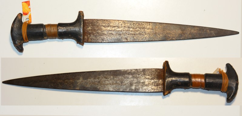 afrikanischer Dolch, deltaförmige 24,5cm lange Klinge, lederüberzogener Holzgriff mit Kupferbandwicklung, an der Spitze fehlt 1mm, und Griff unten eine Ecke des Hefts abgebrochen