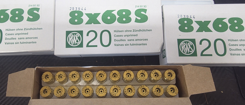 Sie bieten auf 80 Neue Hülsen in Kaliber 8X68S von der Firma RWS. Zusätzlich bekommen Sie 58 1X abgeschossene Hülsen.