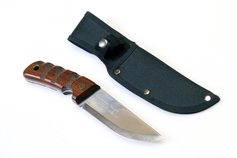 Ergonomisch strukturierter Griff. Durchgehender Erl. Griffschalen aus Edelholz, geschnittene Fingermulden um das Messer griffsicherer zu machen. Der Griff mit Fangriemenöse.