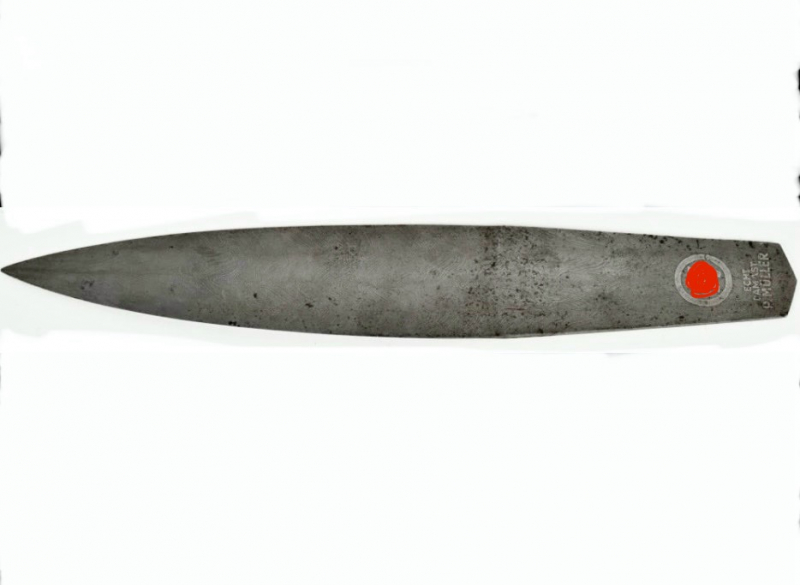 Sehr schöner und gut erhaltener Damast ( 4 Lagen ) Brieföffner vom bekannten Klingenschmied Paul Müller welcher in Dachau bis 1945 arbeitete. Vergoldung der Himmler Widmung ( sein Name als Faksimile Unterschrift ) und des Hersteller Paul Müller sowie des Runenemblem der SS leider vergangen. Stück aus amerikanischer Blankwaffensammlung erworben aus Nachlass des Sammler ( Larry G. ) aus Auktion/ Versteigerung.
