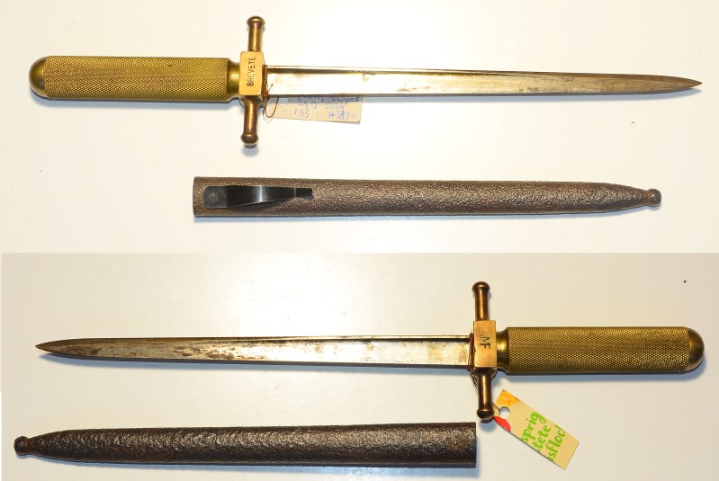 Französischer Behelfs-Grabendolch 1. Weltkrieg, wahrscheinlich Kantinenware, schwerer Messinggriff mit Prägung ""MF" - "Brevete", Klinge Vorderteil einer Gras-Bajonettklinge, Klinge 22.5cm, der Dolch guter bis sehr guter Zustand, die Scheide außen rostig