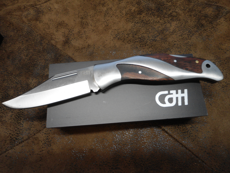 Mit attraktiven Edelstahl, das von Pakkaholz-Einlagen ergänzt wird, punktet dieses CJH Taschenmesser