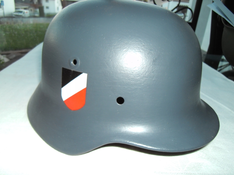 Stahlhelmglocke M40 der Wehrmacht überlackierter Zustand in blaugrau gemäß Fotos, mittlere Größe (Et 66), ohne Innenfutter aber mit Abzeichen.