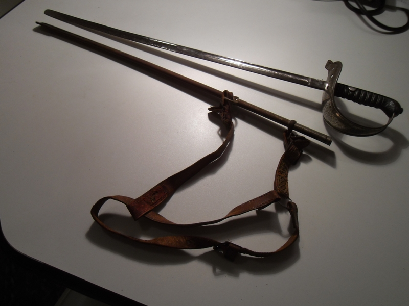 Silberne vernickelte Stahlscheide mit 2 Scheidenringen an denen Lederzeug zum Tragen befestigt ist. Trage und Altersspuren. Vernicklung gealtert. Scheide angerostet (Flugrost). Länge gesamt ohne Scheide: 63 cm, Länge gesamt mit Scheide: 65 cm, Länge der Klinge: 52 cm, Klingenbreite: 1,6 cm.