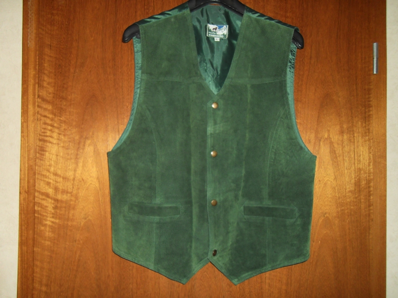 Herren-Weste in Tannengrün, Größe L, Hersteller CROSSING, Vorderseite Wildleder, Rückseite Polyester, zwei Eingrifftaschen, 4 Druckknöpfe zum Schließen. Weite unterhalb des Ärmelausschnitts auf der Vorderseite 68 cm. Länge 68 cm.