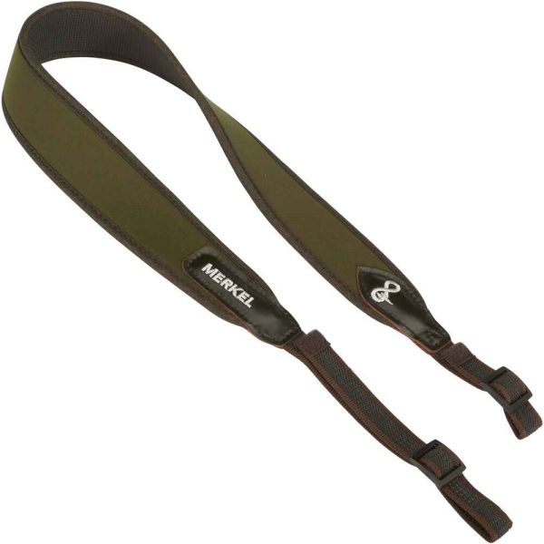 Der Neopren Gewehrriemen von Merkel GEAR ist bequem, hochwertig verarbeitet und lässt Ihre Waffe dank einer gewissen Elastizität leichter erscheinen. Der rund 5 cm breite, weiche Neopren-Teil, bietet genügend Auflagefläche auch für schwerere Waffen. Im Gegensatz zu anderen Riemen ist das Neoprenteil ca. 70 cm lang, sodass die Schulter auch dann noch von der breiten Auflagefläche profitieren kann, wenn die Waffe mit dem Lauf nach unten getragen wird. Die strukturierte, gummiartige Unterfläche des Riemens stellt eine wirkungsvolle Rutschsicherung dar. Der Riemen bietet sich als Auflagemöglichkeit zum Schießen an. Dezenter Logo-Stick auf den Besätzen aus echtem Leder. Gesamtlänge ca. 115 cm.