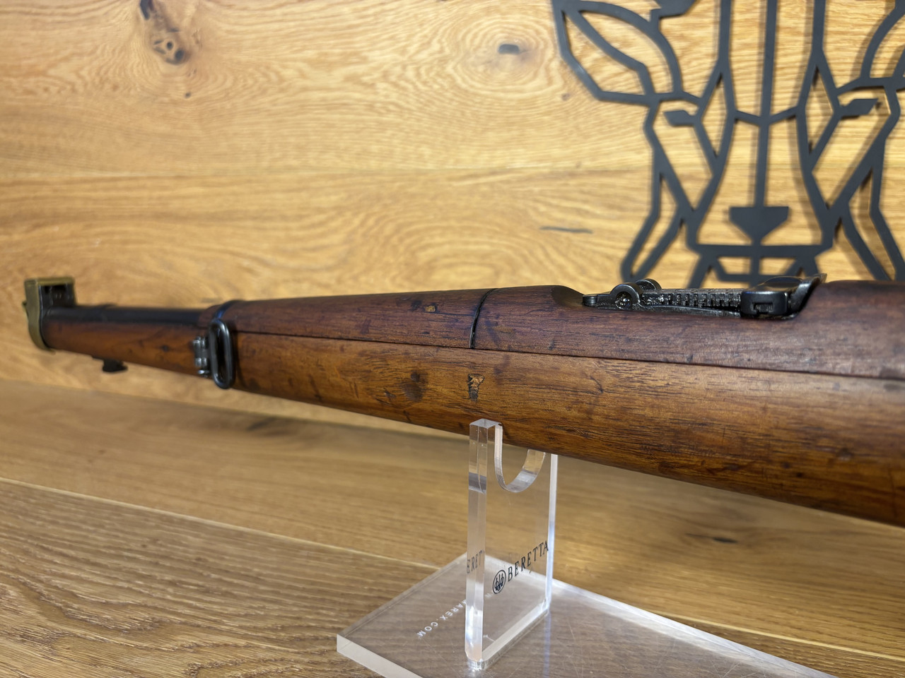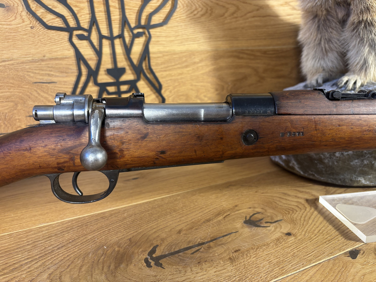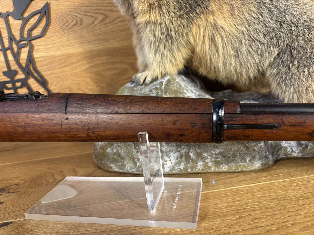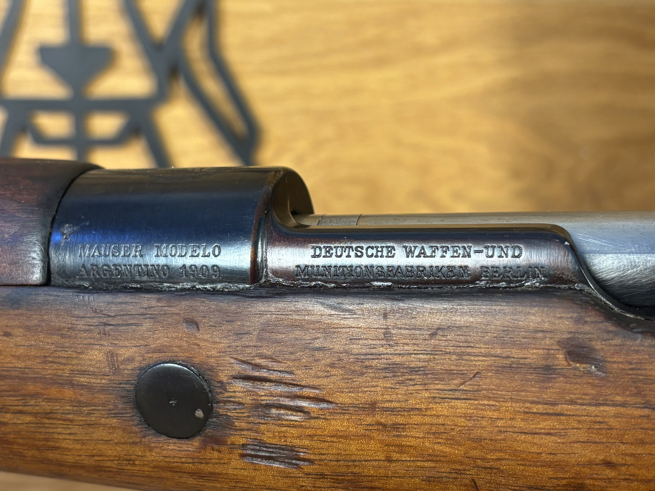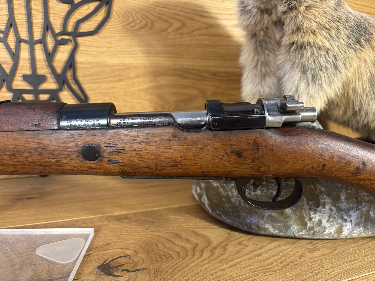 Kaliber: 7,65,53 Arg. Model: DWM Argentino 1909 Lauflänge: ~ 60cm Schaftlänge: 33cm Felder und Züge sind gut sichtbar und ohne Rost. Die Waffe hat starke Gebrauchsspuren, aber wurde nicht überarbeitet. Der Vorderschaft hat hinter der Kimme einen Riss (siehe Bilder)