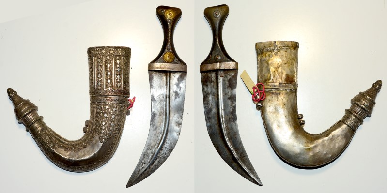 Schöner jeminitischer Jambia mit Horngriff, reich verzierte Scheide mit versilberter oder silberner Zier, Klingenlänge 20 cm