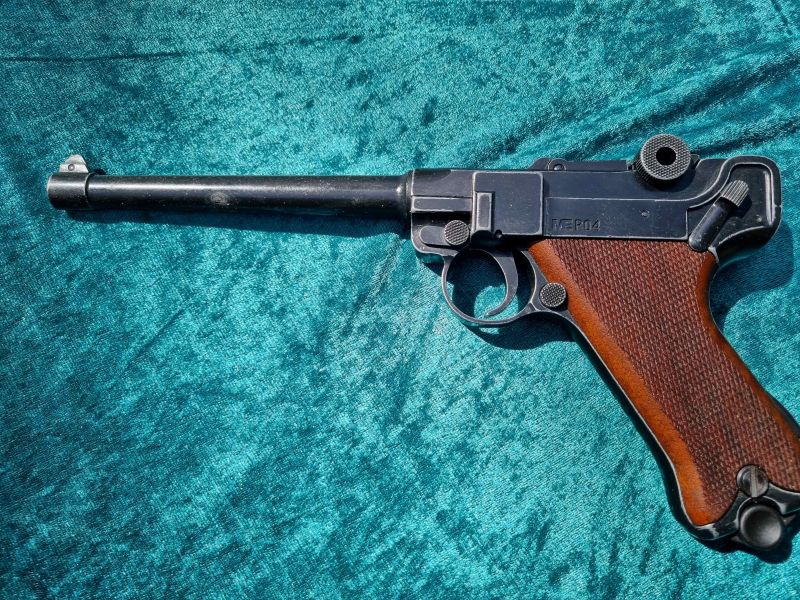 Wunderschöner Nachbau der langen Marine Pistole 08, somit Modell P04. Abmessungen wie dem scharfen Vorbild. Neuwertiger Zustand (original im Antikfinish). Wurde von mir nie geschossen. Aus Sammlerhand (Vitrine). Zustand siehe Fotos, die Bestandteil der Auktionsbeschreibung sind.