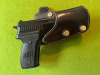 ganz schnell und ohne Werkzeug auf vielen ähnlichen Waffen anderer Hersteller einstellbar. Der Körper besteht aus einem einzigen, dicken 2-lagigen Lederstück, und hat 2 inneren Führungsschienen über den Lauf der Waffe; der auf 2 Winkel umstellbarer Steg ist innen mit Stahlblech verstärkt. Das Holster ist insgesamt aufwendig und hochwertig gefertigt.