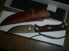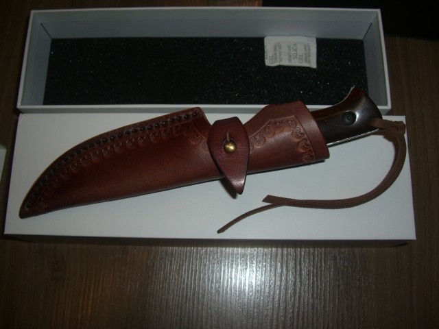 Verkaufe wegen Sammlungsauflösung ein wunderschönes, hochwertiges Jagdmesser mit dunklem polierten Holzgriff, durchgehender Erl (Full Tang), Lanyard, Klinge wunderschön gemasert und rasiermesserscharf mit geprägter Echtlederscheide und Sicherung. Gesamtlänge 22,5cm, Klingenlänge 11cm. Weitere Details siehe Bilder oder auf Nachfrage.