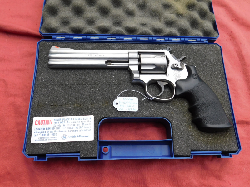 S&W Modell 686-4 Plus mit 7 Schuss -Trommel Kal. 357 Magnum, 6 Zoll Lauf, Lauf innen spiegelblank und Profil scharf. Gefutete Trommel, Timing und Abzug perfekt. Gültiger Beschuss vorhanden. Es ist keine Magnumrille vorhanden. Waffe hat meiner Meinung nach minimale Gebrauchsspuren, Kunststoffgriff S&W