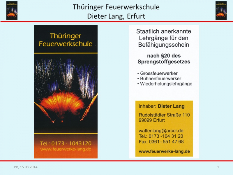 Biete Grund Lehrgang für Großfeuerwerker - für Befähigungsschein -§ 20 des Sprengstoffgesetzes. Lehrgang jeweils von Montag- Freitag. Vorraussetzungen-21 Jahre -Unbedenklichkeitsbescheinigung, Teilnahme an Feuerwerken (20x). Lehrgänge finden in Erfurt statt. Näjhere Auskunft unter 01731043120. (Komplettpreis incl.aller Unterrichtsmaterialien,Verbrauchsmaterialen Prüfungsgebühr ). 1850,00 €. Bezahlung bei Lehrgangsbeginn.