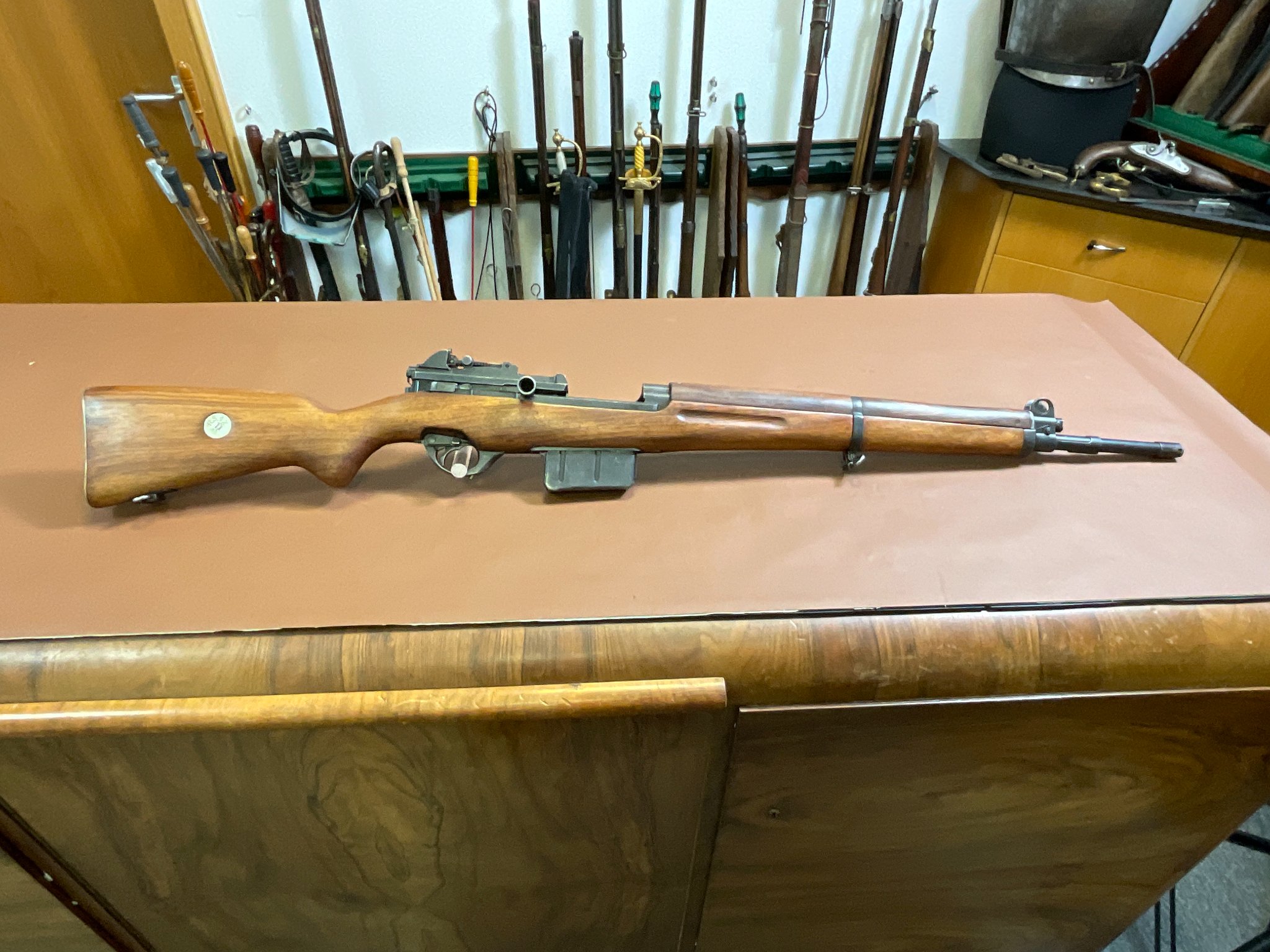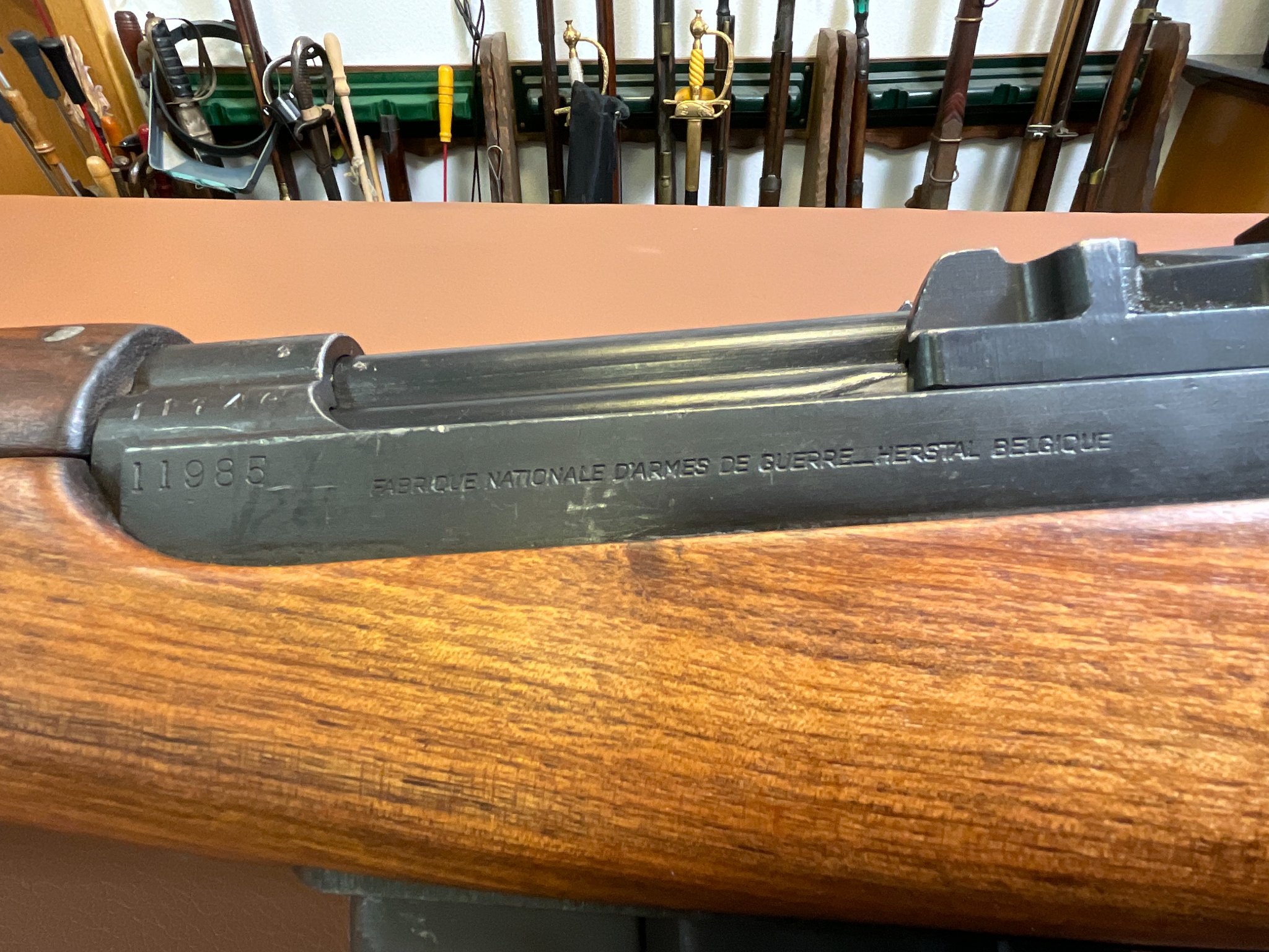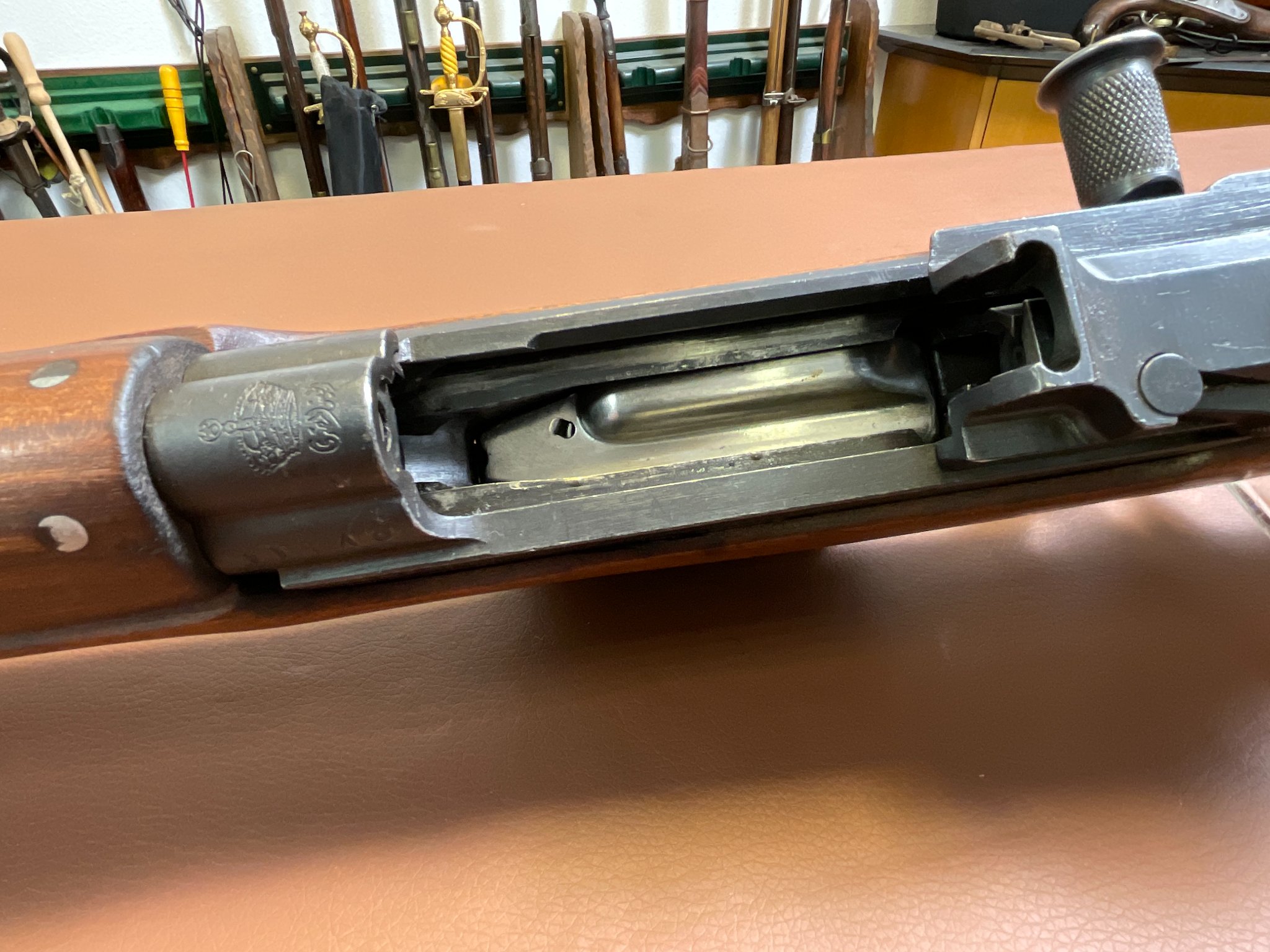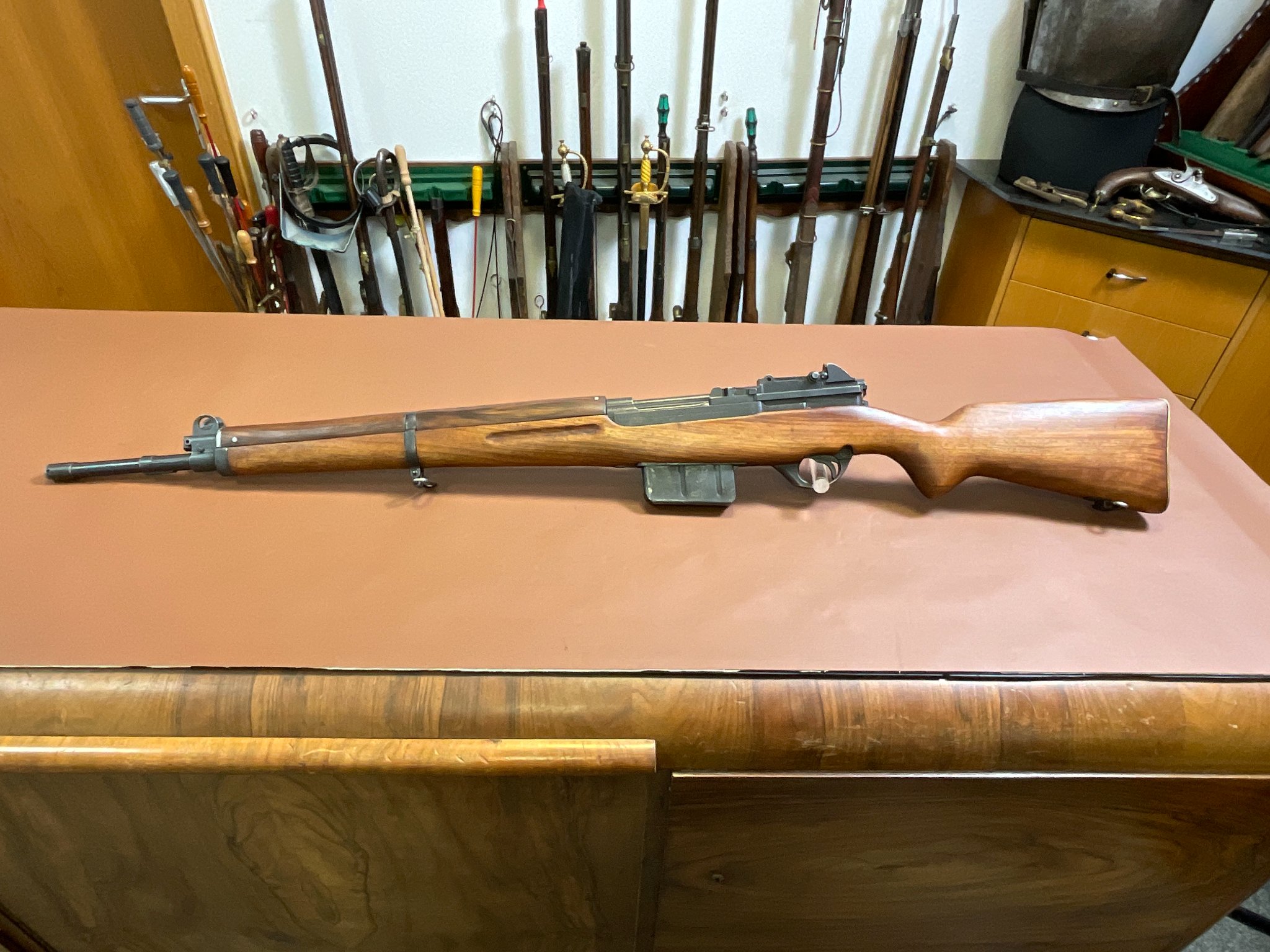 Zum Verkauf steht eine Selbstladebüchse SAFN 49 im Kaliber 8x57 IS. Es handelt sich um eine ehemalige Militärwaffe gefertigt von Fabrique Nationale für das ägyptische Militär.