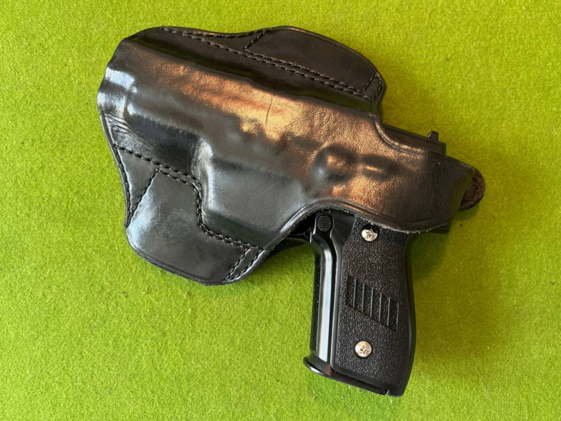 Aus schwarzem, stabilem Leder, Linkshand und mit einem verstärktem Druckknopfverschluss, auch dank der Öffnung am Lauf passend oder leicht anpassbar für einige Großpistolen in diesem Format.