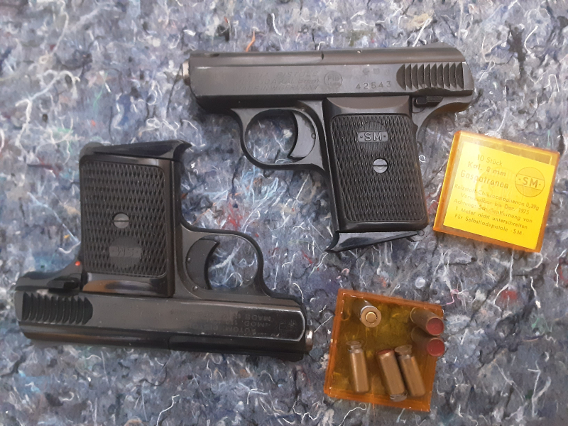 Sammlerset, zwei SM Selbstlade Pistolen, Rhöner Sportwaffen GmbH, SM 110, Kaliber 8mm, PTB 44 / 69b Beschussjahr 73 in gebrauchtem Zustand. Ich habe damit nicht geschossen. Trockenfunktion ist gegeben, Teile Nummerngleich. Sowie SM 110 A PTB 45-69 Beschussjahr 70. Ausschuss oben, Teile Nummerngleich. Ich habe damit nicht geschossen, Trockenfunktion ist gegeben. Eine Original SM Munitionschachtel sit dabei. Inhalt sind Gaspatronen mit Wachsverschluss.