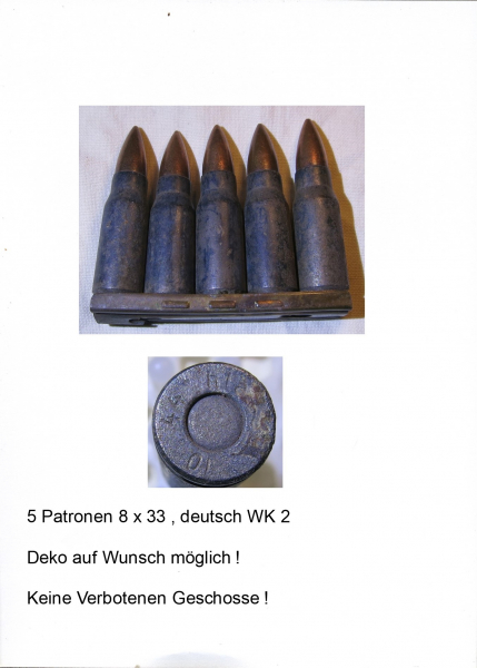 abzugeben. Fünf Patronen 8x33 WK 2. Privater Verkauf kein Umtausch oder Zurücknahme. Versicherter Versand. Keine Garantie oder Gewährleistung. EWB erforderlich !!! Deko möglich !! Beschreibung siehe Bild,,, No Paypal