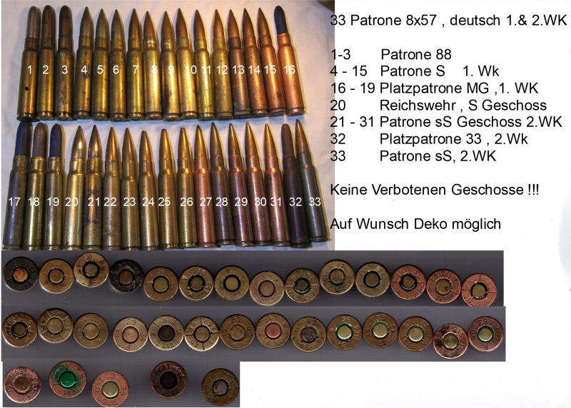 abzugeben 33 Patronen 7,9c57 1. und 2. WK. Privater Verkauf kein Umtausch oder Zurücknahme. Versicherter Versand. Keine Garantie oder Gewährleistung. EWB erforderlich !!!! DEko möglich !!! Beschreibung siehe Bild,, No Paypal