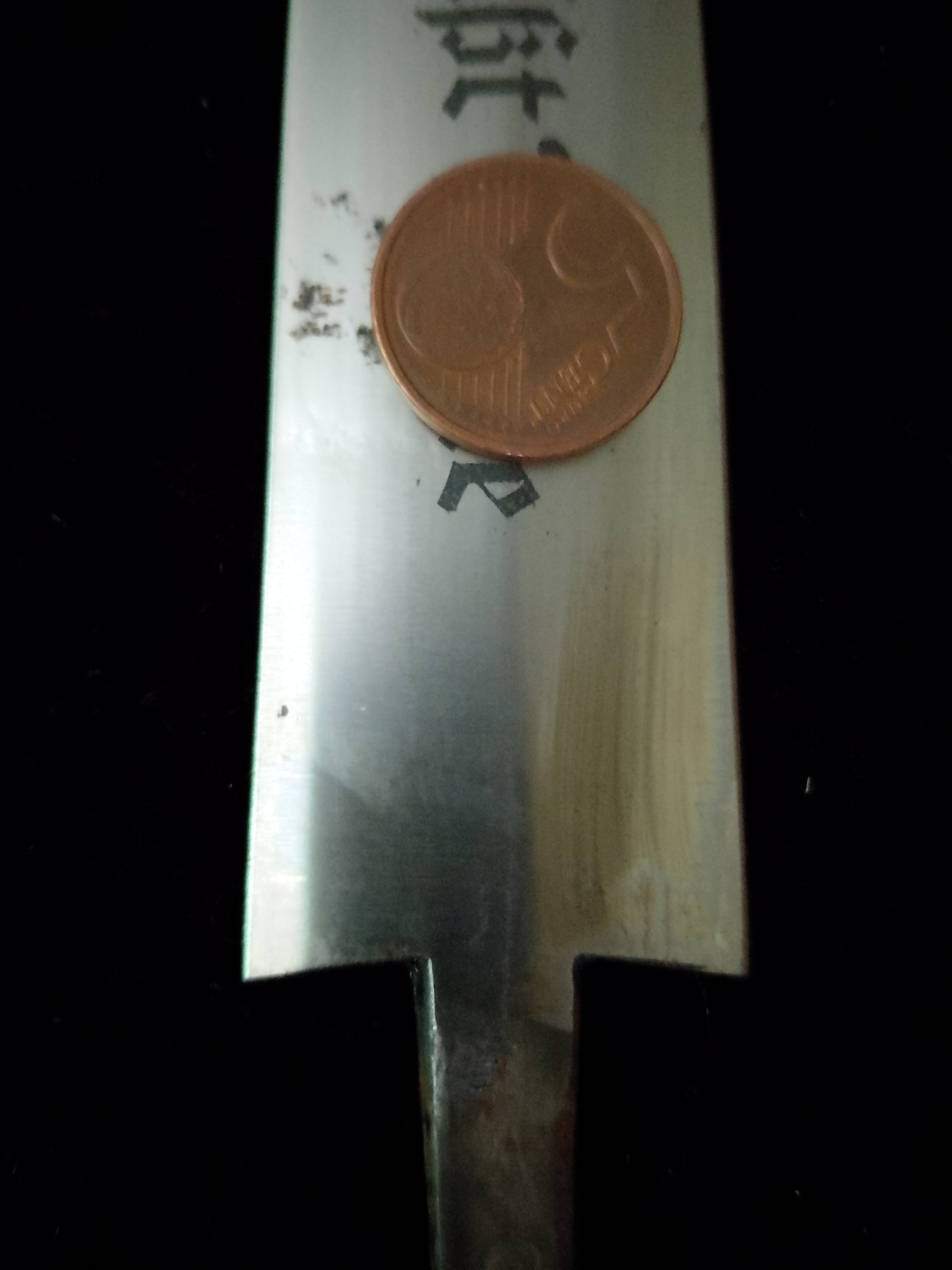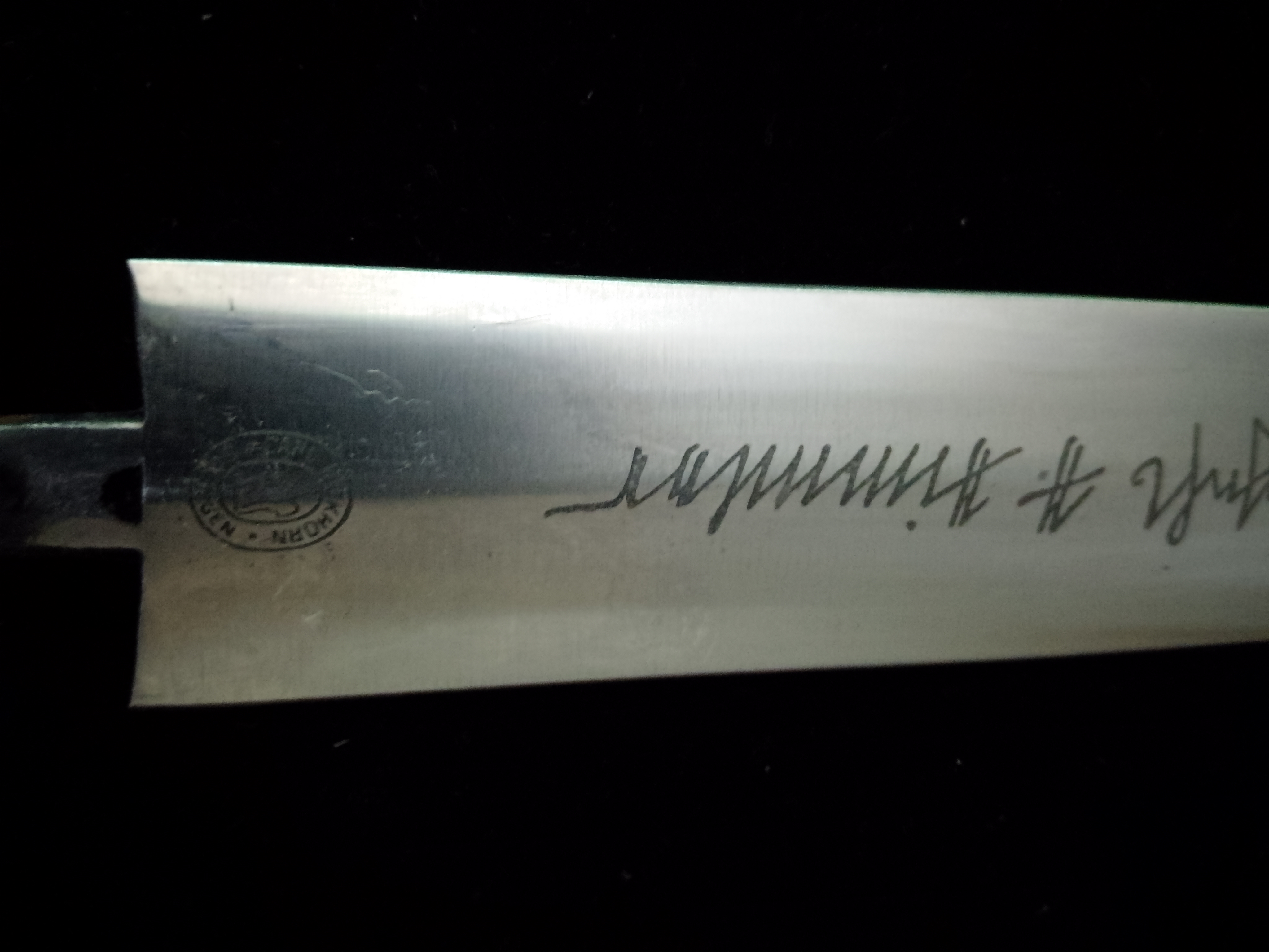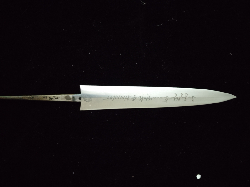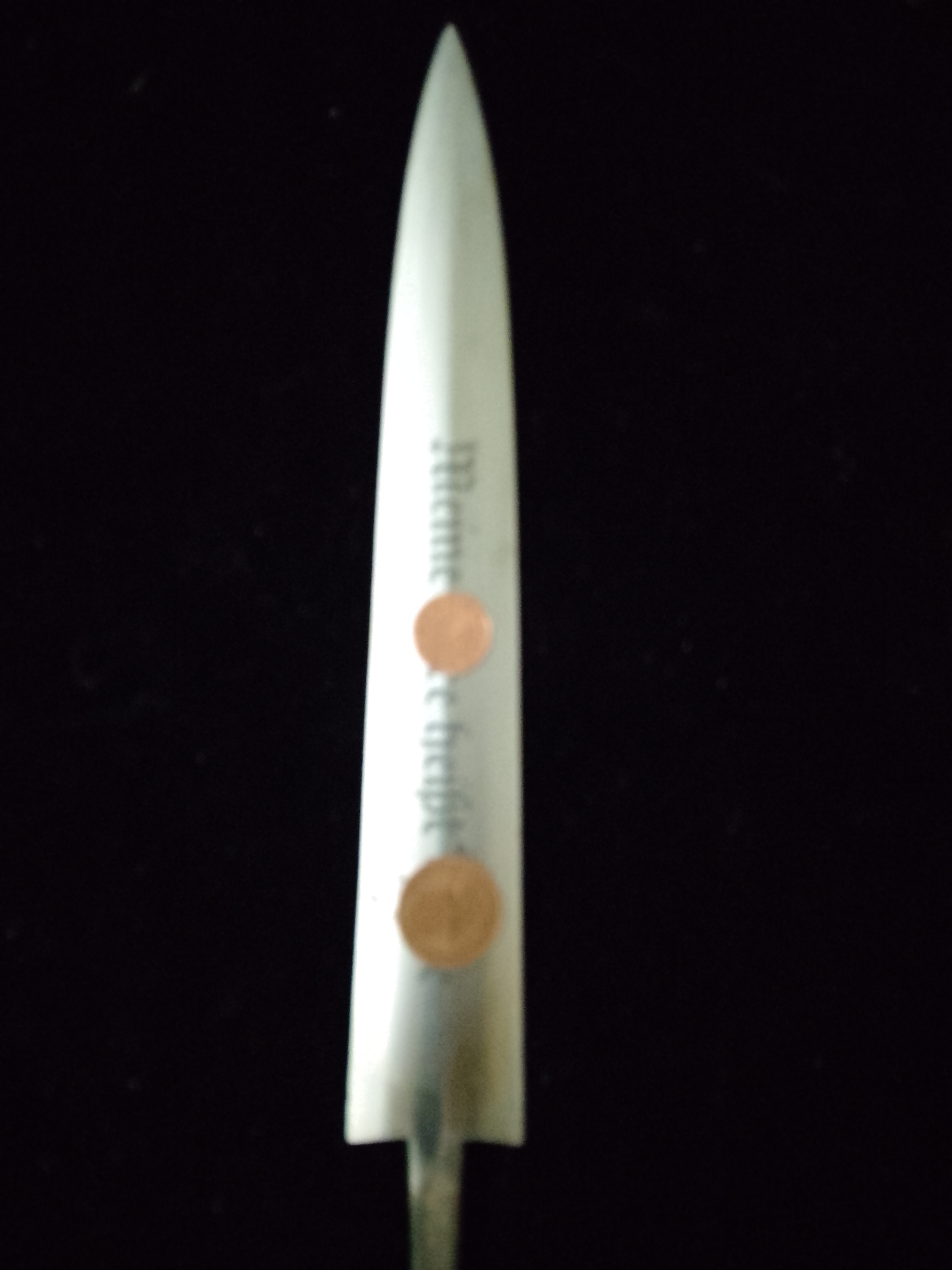 Klinge aus Stahl, im Gesenk geschlagen, geschmiedete Angel mit erhabener Schmiedemarke, intaktes M4 Gewinde, meiner Meinung nach noch nie verbaut.