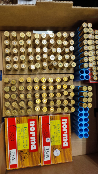 Aus meinem Bestand, 180 Hülsen 7,5x55 Swiss, einmal wiedergeladen, Länge getrimmt. Ladedaten auf der Schachtel. 56 gezündert. 90% Hersteller Norma.
