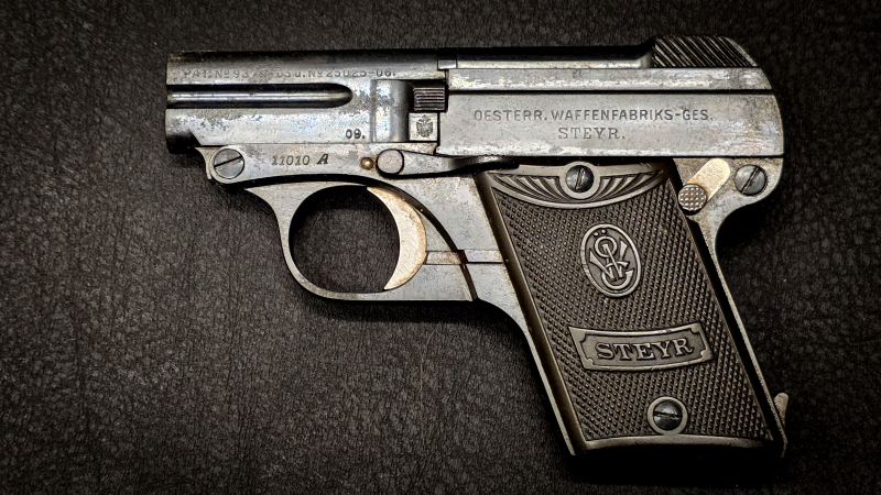 Diese kompakte Selbstladepistole wurde von der Österreichischen Waffenfabriks-Gesellschaft (Steyr) gefertigt und basiert auf einem Patent von Henri Pieper. Das Modell gehört zu den frühen europäischen Taschenpistolen und zeichnet sich durch seinen Kipplauf aus – ein interessantes technisches Detail, das diese Waffe von vielen zeitgenössischen Konstruktionen unterscheidet.