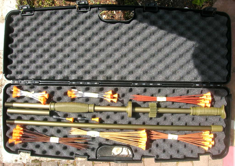 Biete den abgebildeten Koffer mit einem neuwertigen Cold Steel Tim Wells Signature -Slockmaster- Blasrohr mit Pfeilen .625 an. Das Blasrohr ist eine Sonderauflage und hat eine Gesamtlänge von 1,52 m, ist zweigeteilt, grün eloxiert (Aluminium) ist innen von Werk aus besonders „veredelt“ mit allem was man dazu benötigt an Zubehör, im Koffer. Das Teil hat richtig Leistung, ist sehr präzise und mit etwas Übung sind brauchbare Ergebnisse bis 60 Meter kein Problem. In manchen Ländern wird damit gejagt, gibt es auch entsprechende Videos dazu.