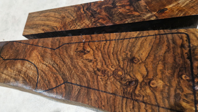 Die ersten Aufnahmen entstanden auf einem leicht angefeuchteten Holzbrett, um die Farben und die Schönheit des fertigen Produkts realistischer darzustellen. Das letzte Bild zeigt die Maße in Zentimetern. Die Konturen wurden auf die tatsächlichen Abmessungen der Blaser F3 übertragen. Die Teile wurden fünf Jahre lang luftgetrocknet. Auf Dampftrocknung wurde verzichtet, um die Farben und die natürlichen Harze des Holzes zu erhalten. Das Ergebnis ist ein elastischerer, festerer und schönerer Schaft