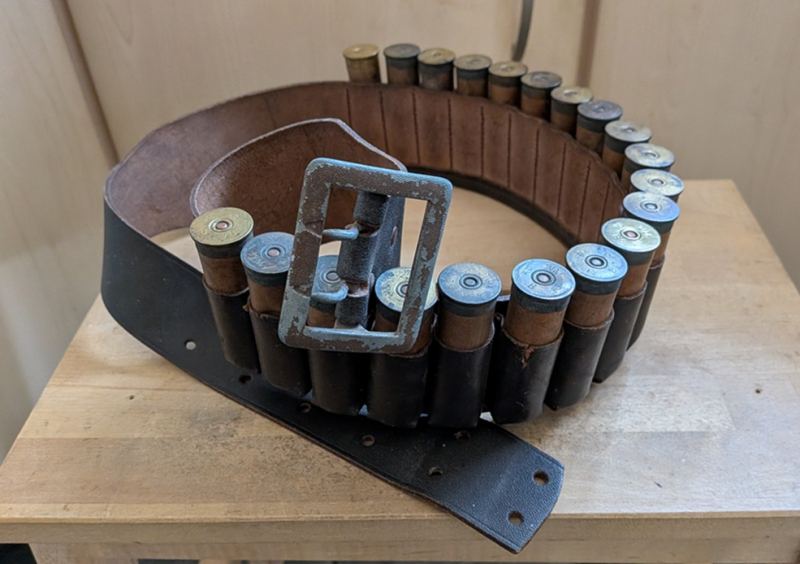verkaufe: einen Schrotpatronengurt befüllt mit 20 Stück alten original Schrotpatronen Kaliber 12 mit Papphülse (die Hülsen sind leer aber gezündert) - maximale Bauchweite bei ca. 104 cm) - der Gurte wurde anscheinend aus einem alten Militärkoppel umgearbeitet - schwarzes Leder, 20 Schlaufen - gebraucht mit stärkeren Gebrauchsspuren (Siehe Fotos!), tragbar
