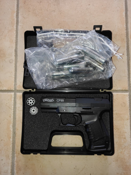 Kaliber 4,5 mm, CO2, Schusszahl (8-schüssig), Zustand sehr gut, Zubehör (Magazine, Originalbox, CO2 Patronen, etc.)