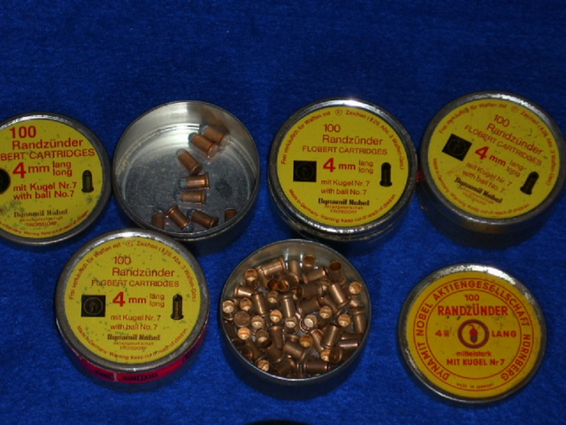 4 mm Randzünder , eine ungeöffnete Dose, eine Dose mit 10 St mit Kugel , eine Dose mit 70 Hülsen ohne Kugel , 2x leere Dosen