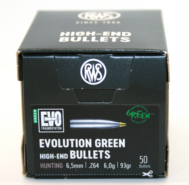 Das RWS EVOLUTION GREEN ist ein bleifreies Teilzerlegungsgeschoss mit einer Reihe von aufeinander abgestimmten Konstruktionsmerkmalen. Die beiden Geschosskerne sind aus lebensmittelechtem Zinn. Das Geschoss eignet sich für alle heimischen Wildarten, spielt seine Stärken jedoch am besten im Bereich leichtes bis mittelschweres Wild aus.