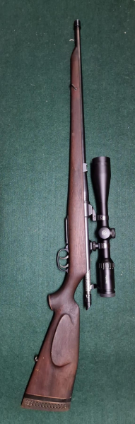 Krico .222 Stutzen mit Mündungsgewinde mit HAWKE 14162 Zielfernrohr VANTAGE SF 6-24x44 Half MIL DOT auf Schenkmontage.