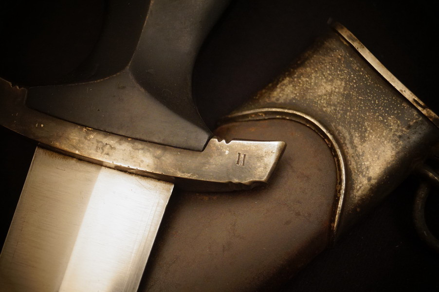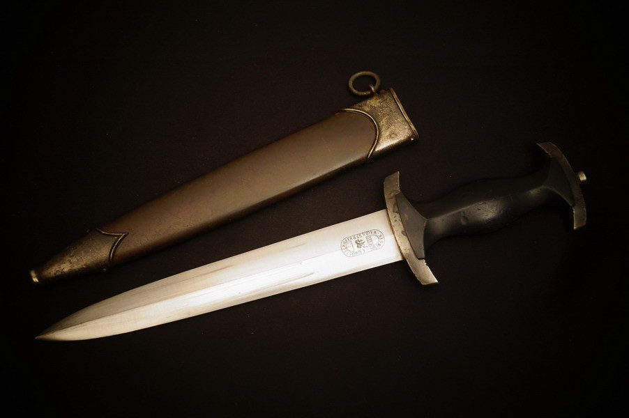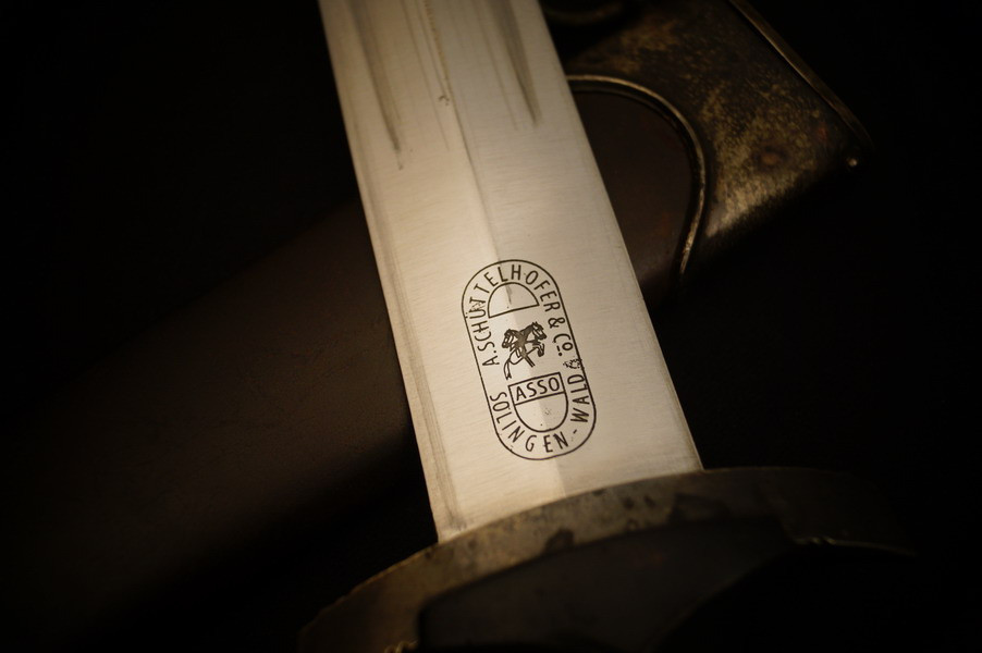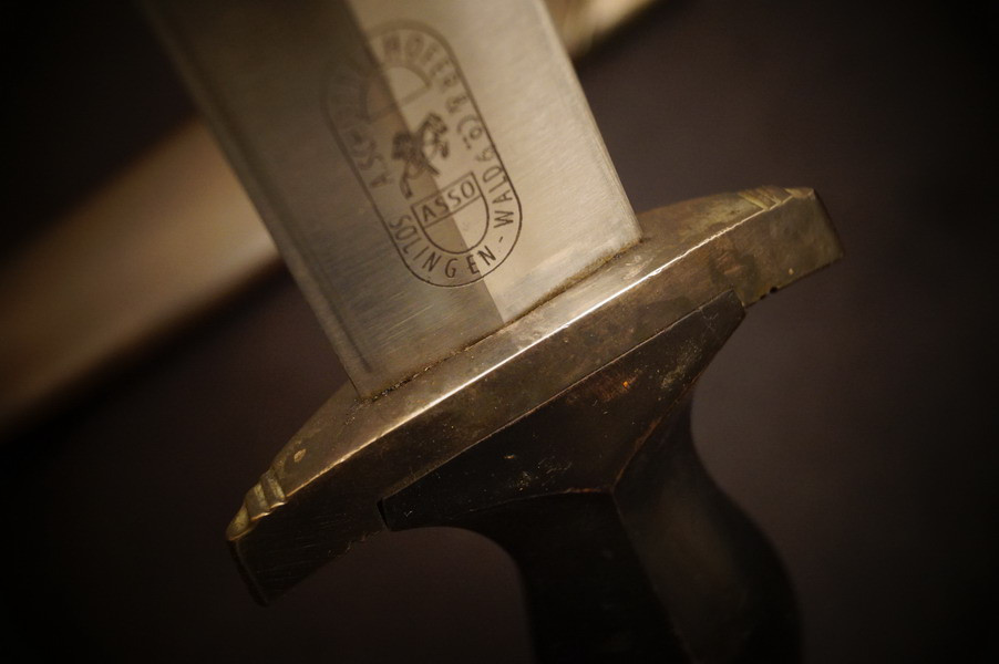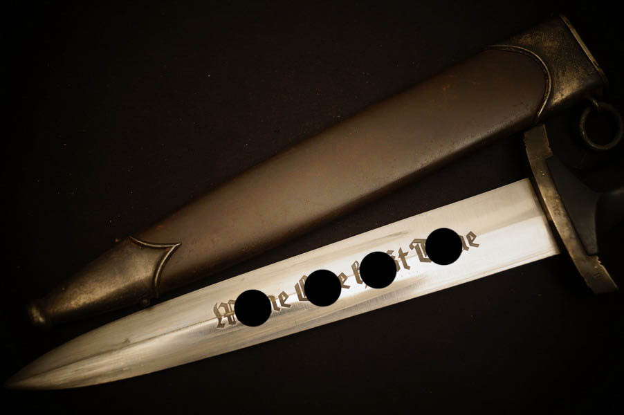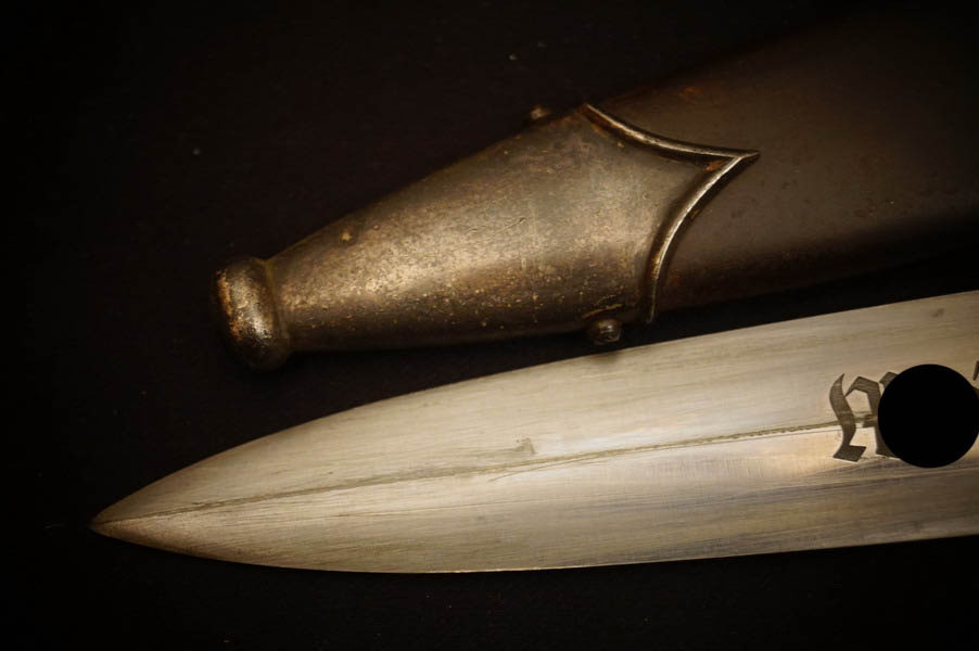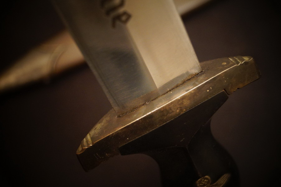 Stahlscheide, brüniert und teils noch Zapponlack erkennbar. Passgenau mit dem Dolch - saugende Scheide. Innen zwei Zungenfedern und sehr guter Sitz der Klinge. Neusilberteile an Scheide und Dolch. Dolch kann man öffnen. Holzgriff mit Neusilber Adler und Pastille. Pastille sind die Runen etwas schief eingelegt - beim tragen sind die Runen senkrecht. Parierstangen mit P und A innen. Klinge geschmiedet mit erhabener Schmiedemarkierung. Motto und Hersteller sind fein geätzt. Klinge ist nicht poliert und hat den original Schliff noch gut sichtbar.