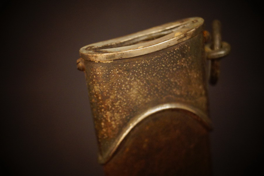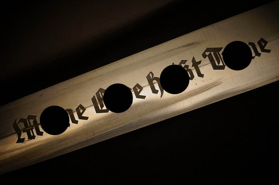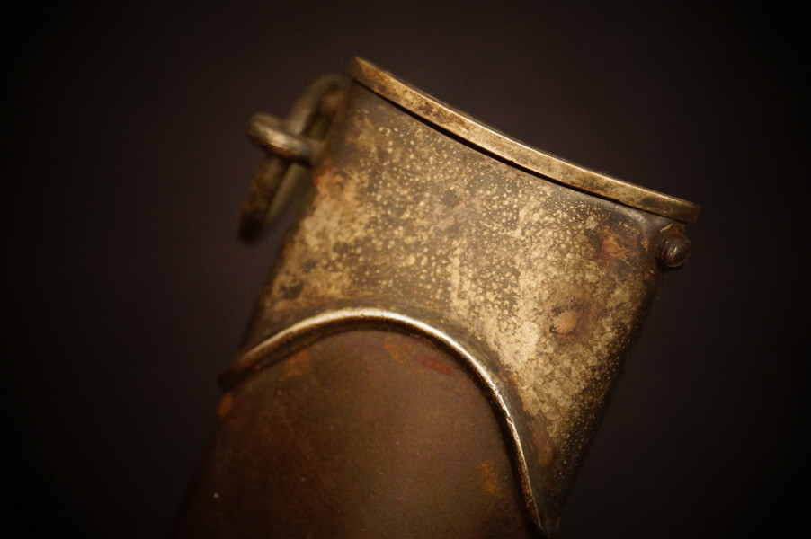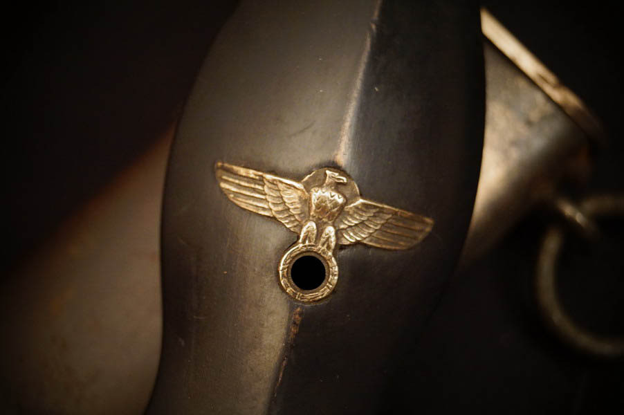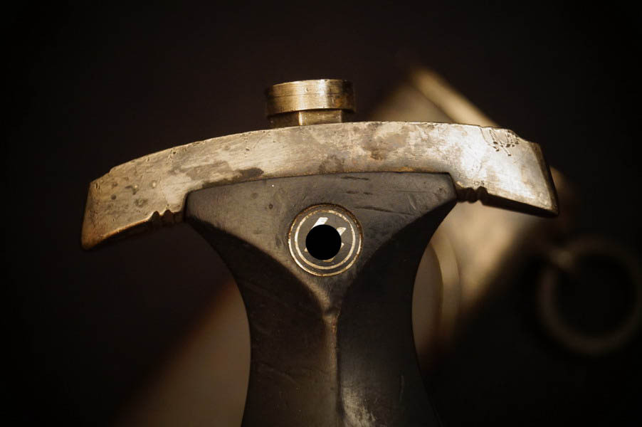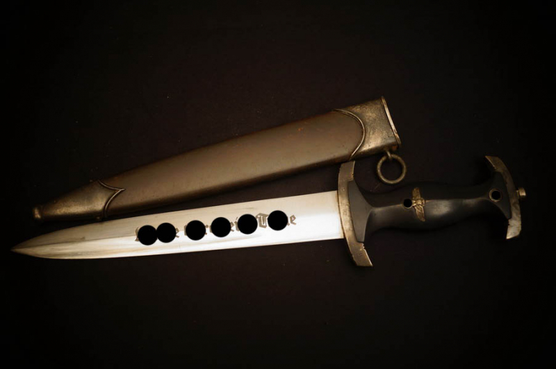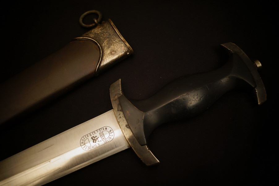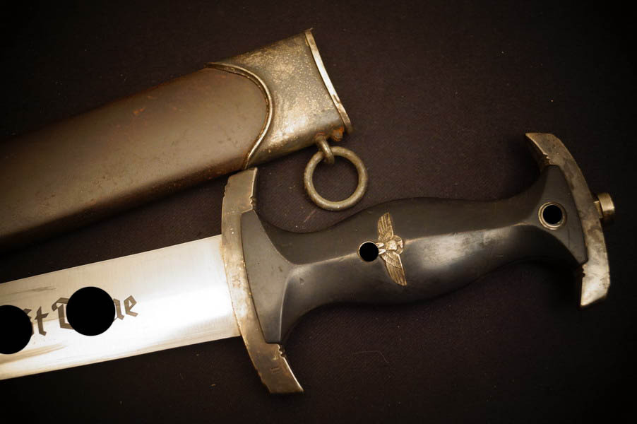 Stahlscheide, brüniert und teils noch Zapponlack erkennbar. Passgenau mit dem Dolch - saugende Scheide. Innen zwei Zungenfedern und sehr guter Sitz der Klinge. Neusilberteile an Scheide und Dolch. Dolch kann man öffnen. Holzgriff mit Neusilber Adler und Pastille. Pastille sind die Runen etwas schief eingelegt - beim tragen sind die Runen senkrecht. Parierstangen mit P und A innen. Klinge geschmiedet mit erhabener Schmiedemarkierung. Motto und Hersteller sind fein geätzt. Klinge ist nicht poliert und hat den original Schliff noch gut sichtbar.