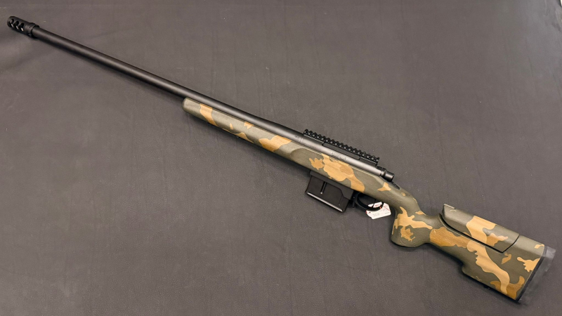 Der Camouflage-Kunststoffschaft mit höhenverstellbarer Schaftbacke bietet eine ergonomische Anpassung an den Schützen. Zusätzlich ist die Waffe mit einer Mündungsbremse ausgestattet, welche den Rückstoß spürbar reduziert.