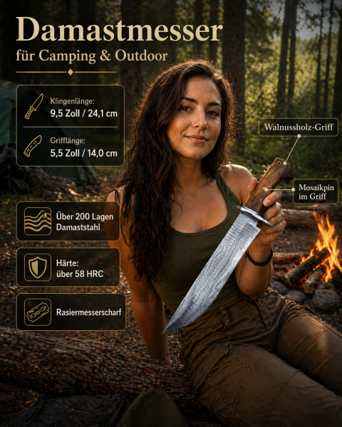Über 200 Lagen Damaststahl • Bowie Messer • Walnussholzgriff • Mosaikpin im Griff • Inklusive Scheide