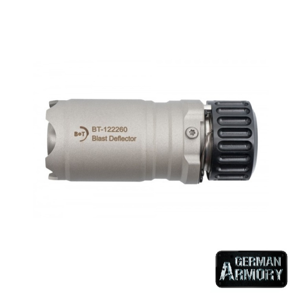 Im sportlichen Schiessen haben Kompensatoren und Mündungsfeuerdämpfer diverse Nachteile. Steht man auf dem Schiessstand nebeneinander in Linie, so bekommt der Nachbar den vollen Mündungsgasdruck und oft auch Schmauchpartikel beim Schuss ab. Das ist nicht nur unangenehm, sondern kann sogar gefährlich werden. Schiesst man im Liegen, so wirbelt der Mündungsgasdruck Dreck, Staub und sogar kleine Steine auf. Dies irritiert beim Schiessen, behindert die Sicht und kann zu Waffenstörungen führen. In solchen Fällen ist der B&T Blast Deflector die perfekte Lösung. Er kann in wenigen Sekunden auf allen Rotex-IIA kompatiblen Mündungsfeuerdämpfern und Kompensatoren in den Kalibern .223 (5.56mm) und .308 (7.62 mm) aufgesetzt werden. Der B&T Blast Deflector bremst die Mündungsgase ab und verhindert ein seitliches Austreten. Somit wird die Gefährdung von Nachbarschützen und das Aufwirbeln von Dreck zuverlässig verhindert. Durch sein Gewicht von 238 Gramm hilft der B&T Blast Deflector auch sehr gut die Mündungsbewegung im Schuss zu reduzieren, wodurch schnellere Folgeschüsse möglich sind. Eine Schallreduzierung findet durch den B&T Blast Deflector nicht statt. Er ist daher frei erwerbbar. Wir haben passende Flashhider mit M15X1 und 1/2X28 Gewinde im Angebot.