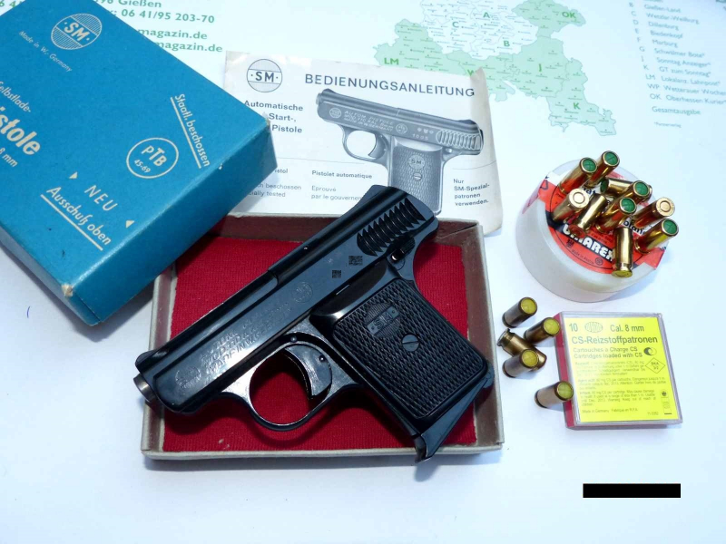 ACHTUNG ! hier kommt eine 55 JAHRE alte originale und sehr schöne SM Mod.110A im starken Kal.8mm Beschuss: 1972. Beste "Made in Germany"-Qualität welche heute nicht mehr zu bekommen ist Kenner wissen bescheid sehr zuverlässig und stabil. Eine der besten Nachbauten SM 11 im Kaliber 6,35 Browning. Diese Waffe wurde bis auf minimale Abweichungen als scharfe Waffe im Kaliber 6,35 gebaut. Die angebotene Pistole im Kaliber 8mm hat einen Stahllauf und ein Stahlsystem im inneren in kompakter solider und sehr stabilen Bauweise. Der Ausschuss ist oben durch zwei Nasenlöcher. Unter dieser ersten PTB 45-69 wurde diese Waffe, unter begrenzte Stückzahlen gefertigt (siehe NR. 8597), die Nummern wurden zwecks Datenschutz wegkaschiert. Die Pistole ist mit dem Schlitten Nr.- gleich sowie die originale Verpackung. Aufgrund der heutigen Bestimmungen sind diese Zeiten leider vorbei. Diese Waffe darf in diesem Kaliber heute nicht mehr gebaut werden. Diese Waffe wurde nicht benutzt und befindet sich in einem absoluten neuen Zustand (SIEHE BILDER) sonst kein Rost auch nicht im Patronenlager wie sonst üblich durch überlagern, auch sonst keine Beschädigungen. ACHTUNG BEI DIESEM MODELL MUSS MAN LEISTUNGSSTARKE PATRONEN VERWENDEN. Es ist Privatverkauf Gewährleistung u. Rückgabe ausgeschlossen. Im Lieferumfang: 1 Pistole SM 110A Beschuss: 1969 Kal. 8mm mit Magazin, originale Verpackung, sowie die abgebildeten originalen Papiere Bedienungsanleitung von damals, dazu noch Restplatzpatronen von HP sowie alte CS Gaspatronen von Wadie und Umarex alle sehr leistungsstark mit 600 Bar Gasdruck gehören ebenfalls dazu. Achtung: Der Altersnachweis ist erforderlich. Es ist ein Privatverkauf, Gewährleistung u. Rückgabe sind ausgeschlossen. Versand nur innerhalb Deutschland. Kein internationaler Versand. Viel Spaß beim Bieten und Ersteigern. Der Transport muss als Gefahrgut durchgeführt werden, die höheren Transportkosten fallen selbstverständlich nur 1 x an, egal, wieviel Sie kaufen.